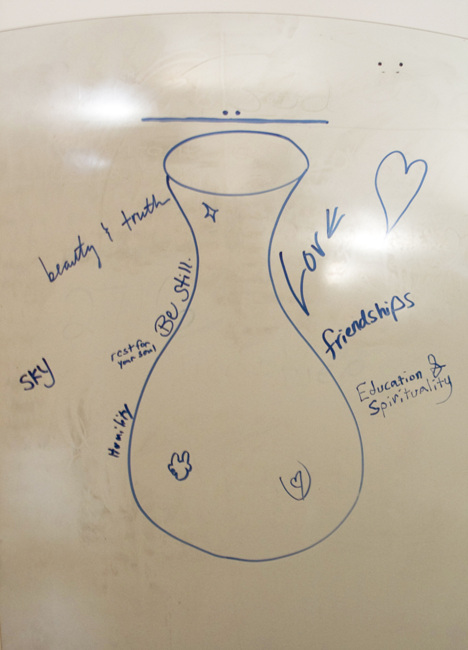 Eric, one of the interns at the Fallout, had an idea to do a peace bottle on the white board. KimyiBo draws a bottle, people fill it in with peace.