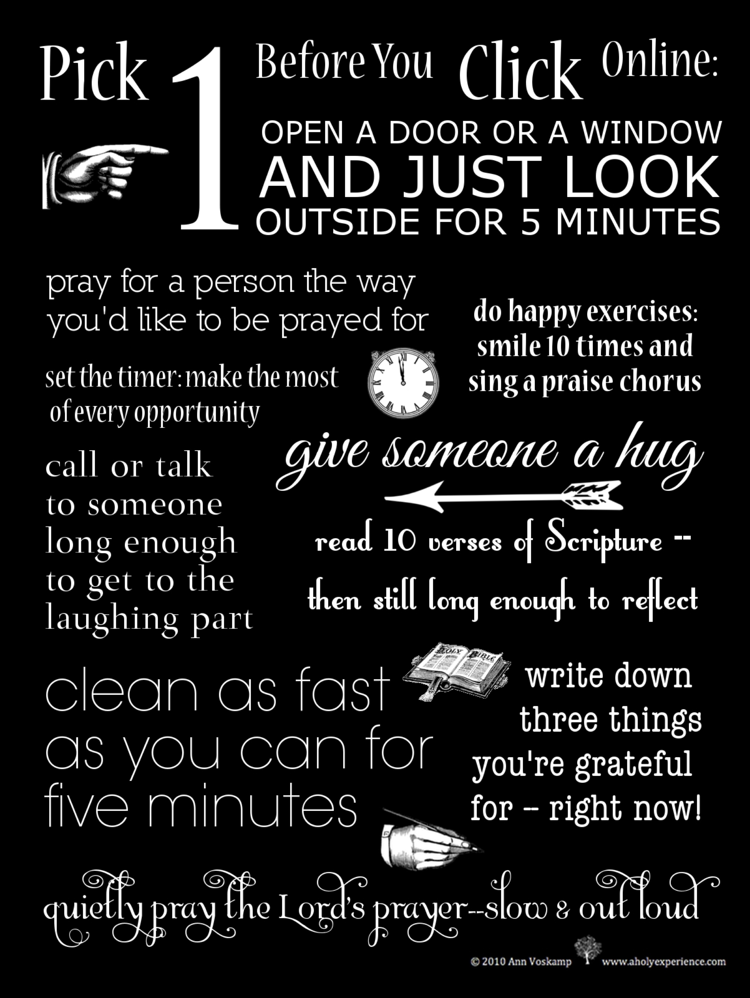 Today, reading Ann’s Blog, A Holy Experience, (www.aholyexperience.com) I learned that resisting distraction to stay focused is how we stay disciplined. I would like to post Ann’s tips on staying focused here. You can see the original source on her blog entry for June 16,2014.
