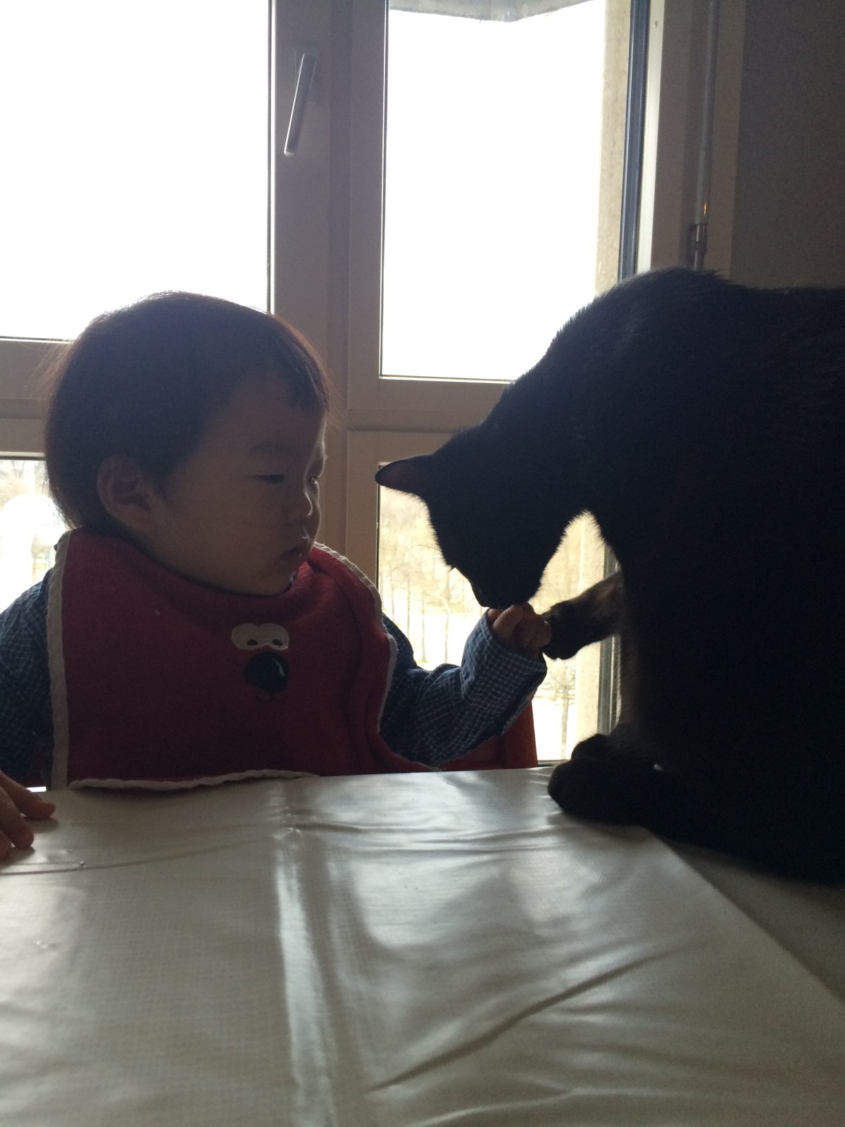 Beginning of this year Faith and Zuka met for the first time at M’s. M is an auntie who takes care of Faith while the artist mommy goes to her studio. In January Faith used to scream around Zuka with half real fear and half fascination. Zuka found a new hiding spot in the under pocket of Faith’s stroller. Other than that I don’t know much about their interactions.